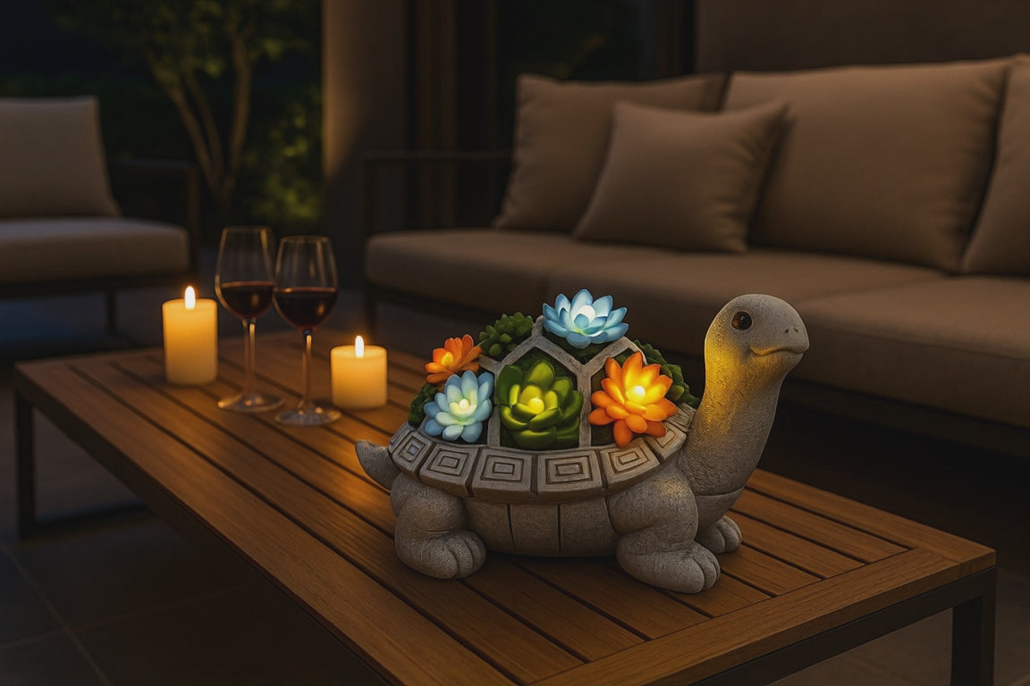 Décoration de jardin tortue avec éclairage LED solaire et plantes succulentes illuminées.